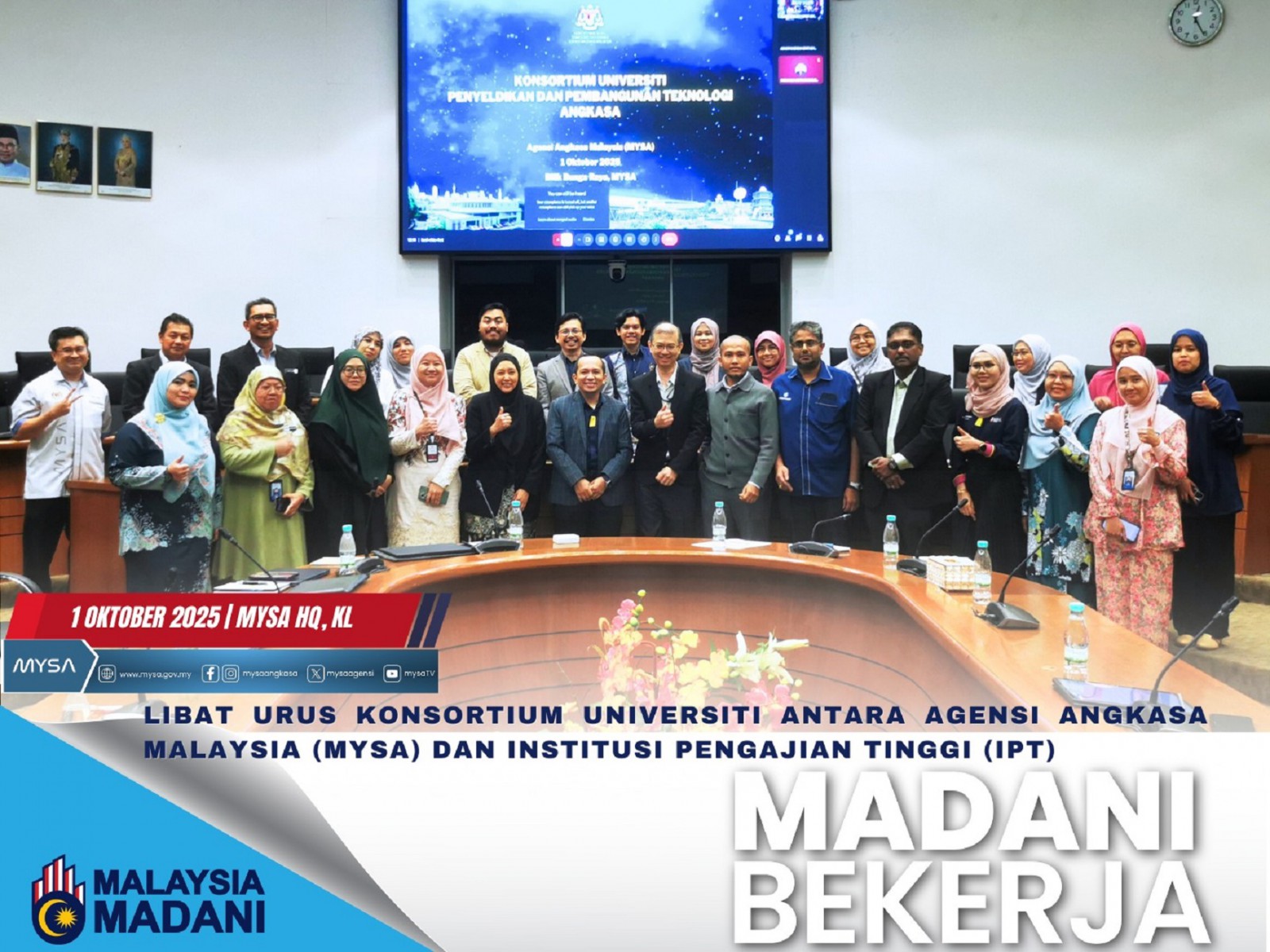 Libat Urus Konsortium Universiti antara Agensi Angkasa Malaysia (MYSA) dan Institusi Pengajian Tinggi (IPT) yang dipengerusikan oleh YBrs. Puan Nik Mazlina binti Nik Mustapha, Timbalan Ketua Pengarah (Perkhidmatan Teknikal dan Operasi) MYSA pada 1 Oktober 2025, bertempat di Ibu Pejabat MYSA, Kuala Lumpur.