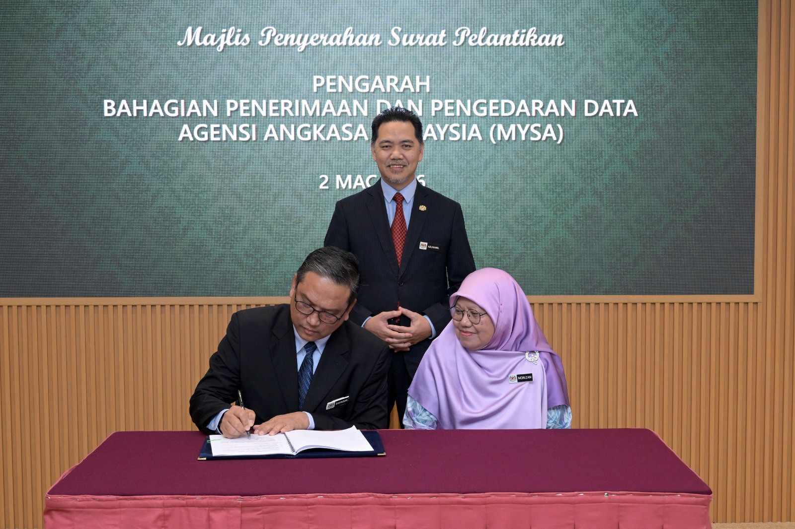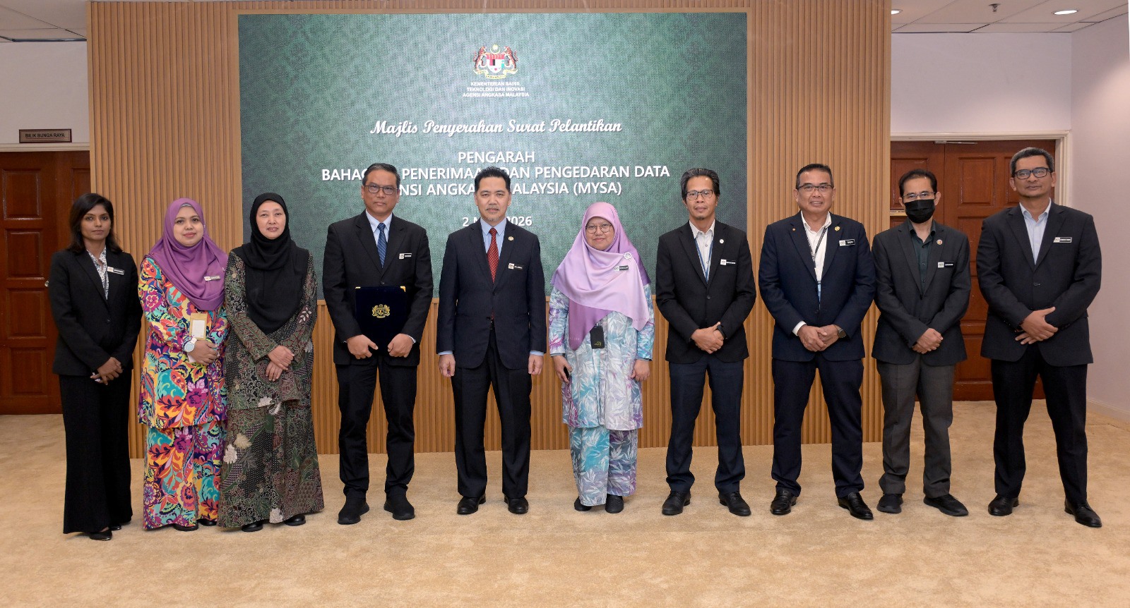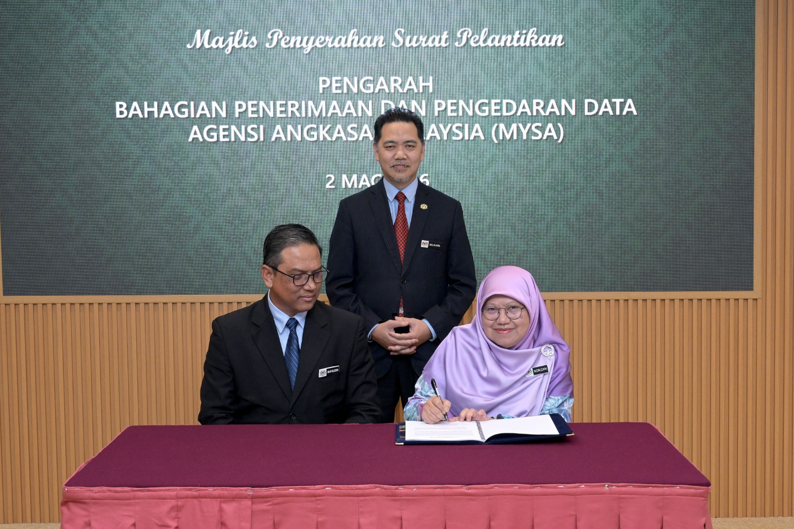Majlis Penyerahan Nota Serah Terima Tugas dan Pelantikan Pengarah Bahagian Penerimaan dan Pengedaran Data (BPD) telah berlangsung pada 2 Mac 2026, Ibu Pejabat Agensi Angkasa Malaysia (MYSA), Kuala Lumpur.