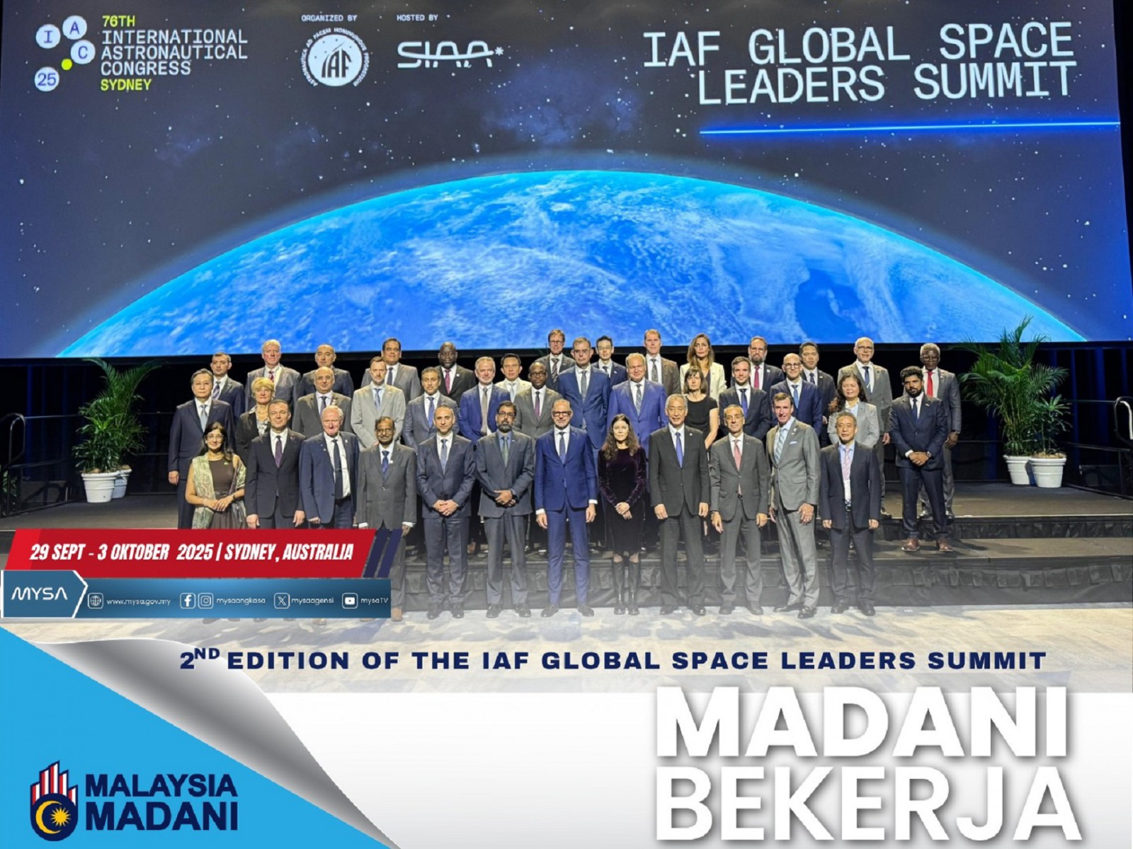 Sesi IAF Global Space Leaders Summit adalah platform perjumpaan pemimpin-pemimpin sektor angkasa dari seluruh dunia untuk bertukar pandangan dan idea. Sesi ini adalah sebahagian daripada pengisian 76th International Astronautical Congress (IAC) 2025 yang sedang berlangsung di Sydney, Australia pada 29 September hingga 3 Oktober 2025.